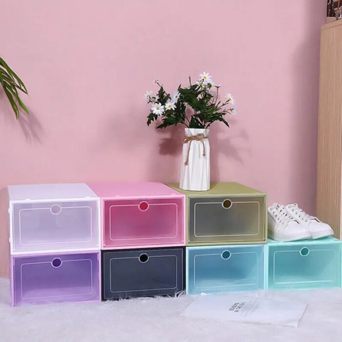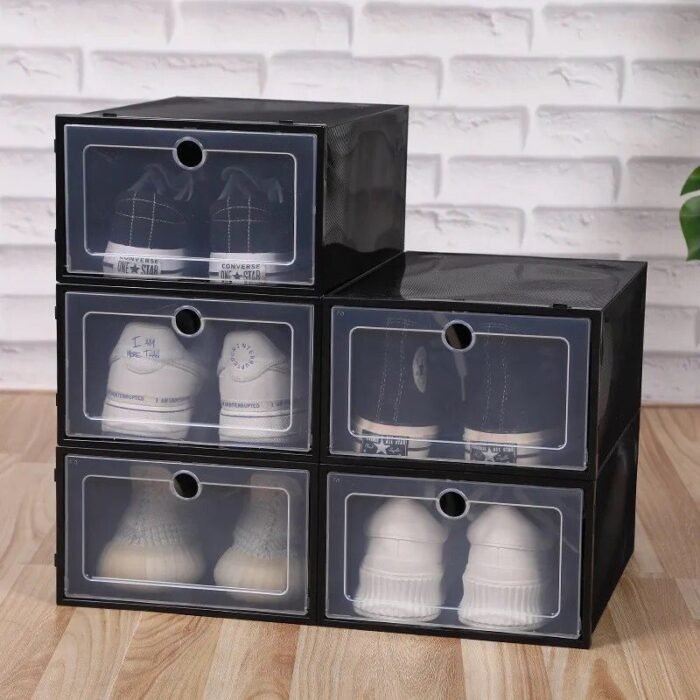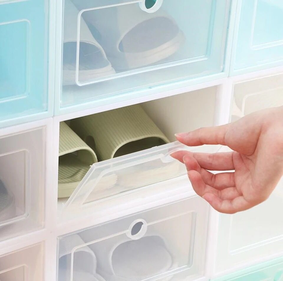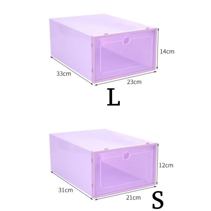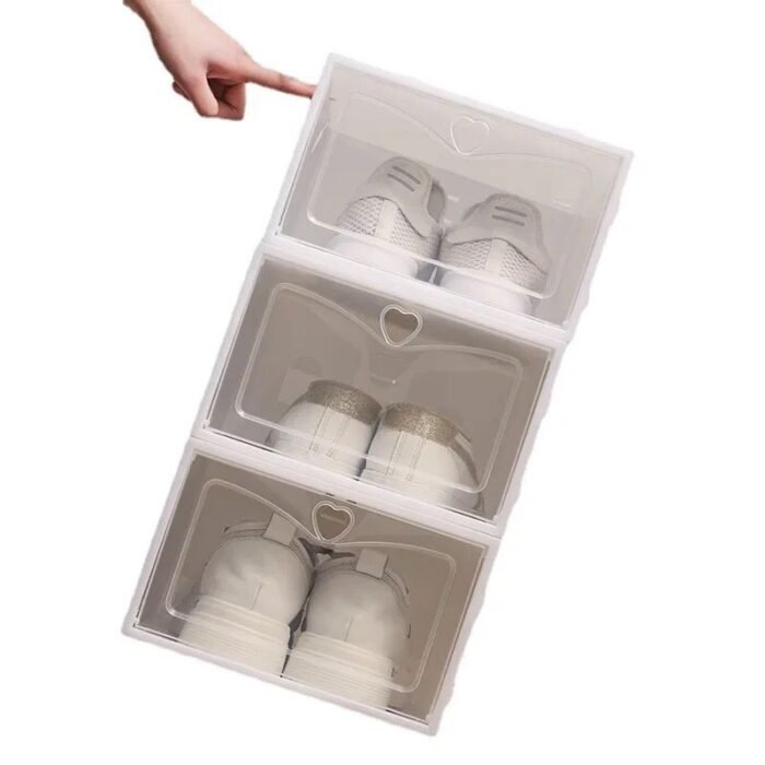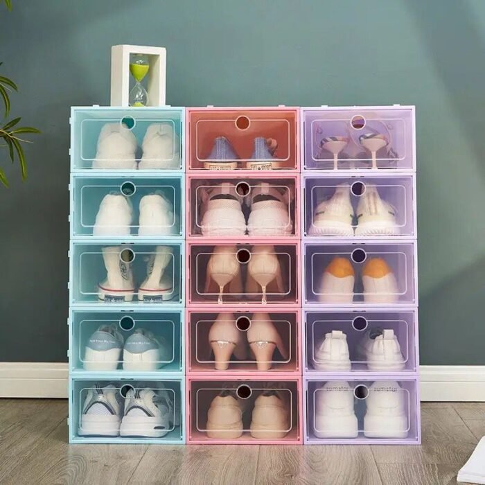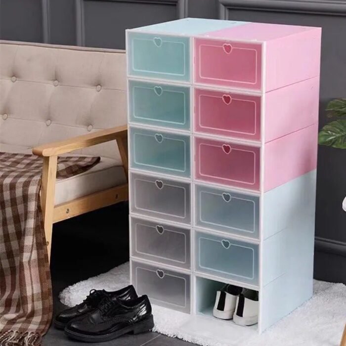 - Stackable plastic shoe box :Designed as a simple interlocking vertical system, these plastic boxes for storage can be stacked on top of each other to save space in your closet. Through improved slots fixed firmly so that support stacking heavy weight. No worry that wiggle and out of shape. Super easy to assembly and take apart.